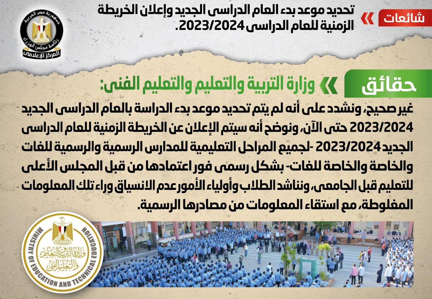 وقام المركز الإعلامي لمجلس الوزراء بالتواصل مع وزارة التربية والتعليم والتعليم الفني، والتي نفت تلك الأنباء، مُؤكدةً أنه لا صحة لتحديد موعد بدء العام الدراسي الجديد وإعلان الخريطة الزمنية للعام الدراسي 2023/2024.