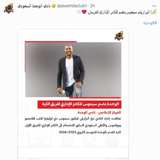 وتابع في البيان الوحدة يضم سيموس للكادر الإداري لفريق الكرة: "تعاقدات إدارة النادي مع البرازيلي فيكتور سيموس دي اوليفيرا لاعب فلامنجو ويوفنتوس والأهلي السعودي السابق، للانضمام إلى الكادر الإداري للفريق الأول لكرة القدم في موسم 2023\ 2024".