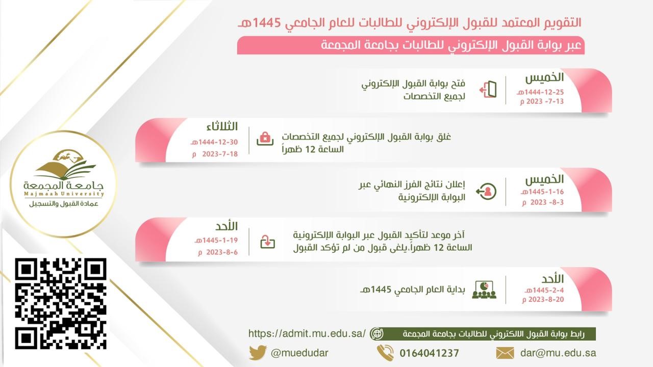 أعلنت جامعة المجمعة السعودية ممثلة في عمادة القبول والتسجيل، عن بدء استقبال طلبات القبول لجميع التخصصات للعام الجامعي المقبل 1445هـ، وذلك للطالبات فقط بداية من اليوم الخميس الموافق 25 ذي الحجة 1444هـ/ 13 يوليو 2023.