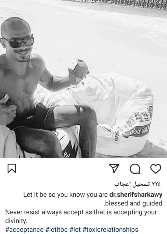كتب شريف شرقاوي عبر حسابه الشخصي بموقع تبادل الصور والفيديوهات "إنستجرام": "دعها تعرف إنك مبارك ومرشد لا تقاوم أبدًا، تقبل دائمًا لأن هذا هو قبول ألوهيتك".