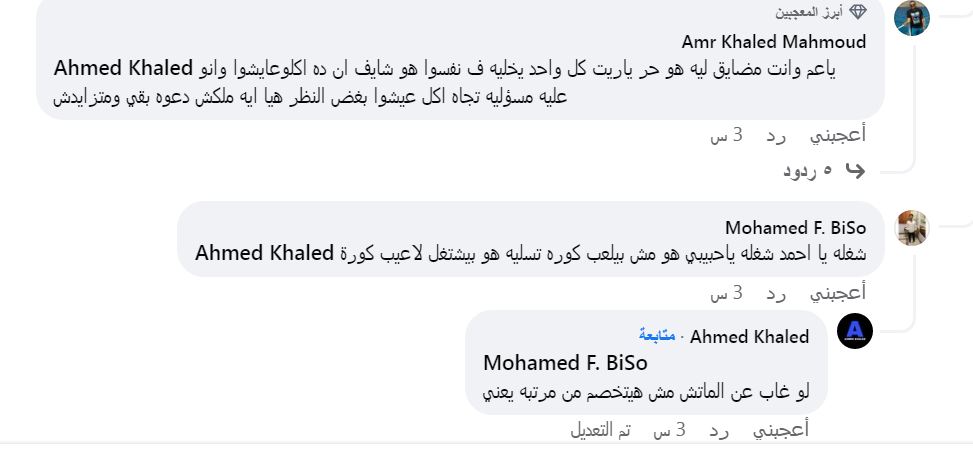 علق حساب باسم أحمد قائلًا: "لا معلش هو الطبيعي إن اللي أبوه يموت يروح بعدها يشتغل في نفس اليوم؟ وهنا بكلمك على المواطن العادي مش لاعيب كورة بياخد ملايين، الطبيعي إنه لأ، فـ لما حد يعمل عكس كدة طبيعي اتهكم على فعله واعتبره سيئ جدًّا أنا مستغرب تبرير الناس بصراحة".
