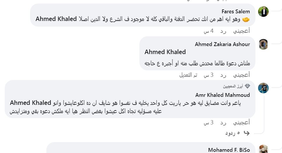 علَّق فارس : "وهو ايه أهم من إنك تحضر الدفنة والباقي كله لا موجود ف الشرع ولا الدين أصلا".