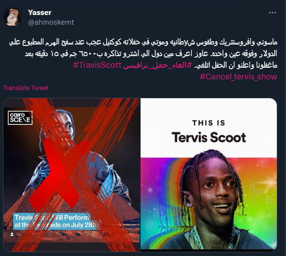 بعد إعلان مغني الراب ترافيس سكوت عن موعد حفله القادم الذي سيقام في مصر بـ "سفح الأهرامات" في 28 يوليو الجاري، سادت حالة من الجدل والغضب الشديد من قبل رواد مواقع التواصل الاجتماعي، ودشنوا هشتاج "إلغاء حفل ترافيس"، وسط اتهام خطيرة بأن الرابر العالمي ماسوني وداعم للأفروسنتريك ويمارس طقوسًا شيطانية.