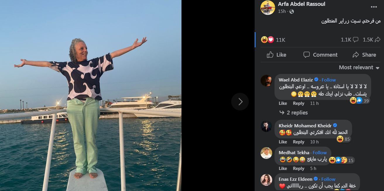 أثار الفنانة عارفة عبدالرسول سخرية الجمهور بنشر صورة غير متوقعة من أحدث ظهور لها على متن قارب في عرض البحر، وذلك عبر حسابها الشخصي بموقع التواصل الاجتماعي الأشهر "فيس بوك".