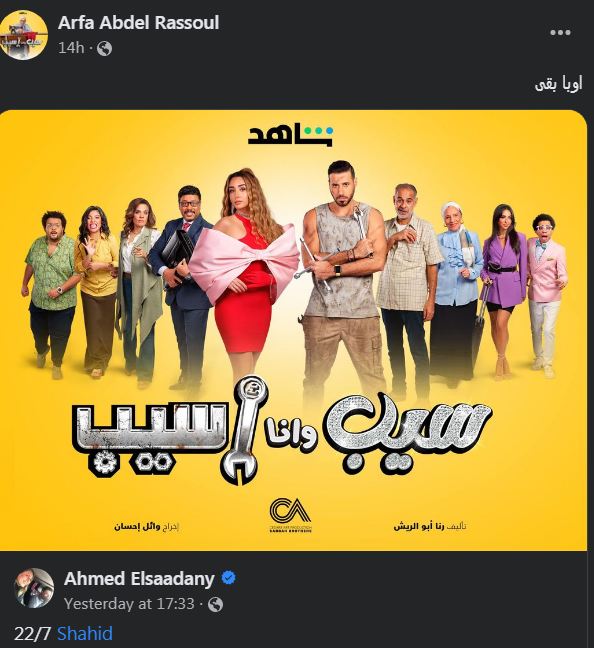 على صعيد آخر، روجت عارفة عبدالرسول لأحدث مسلسلاتها "سيب وأنا أسيب" الذي تنتظر عرضه ابتداءً من يوم 22 يوليو الجاري، على منصة "شاهد" الإلكترونية، إذْ شاركت الجمهور بصورة من بوستر المسلسل وأرفقتها بتعليق: "أوبا بقى"، وذلك عبر حسابها الشخصي بموقع التواصل الاجتماعي الأشهر "فيس بوك".