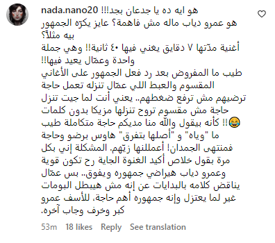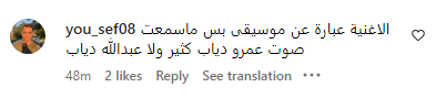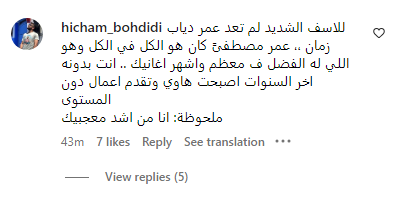 وبعد هذا الكومنت توالت التعليقات السلبية على الحساب الرسمي الخاص بالفنان عمرو دياب حيث جاءت كالآتي، "للأسف الشديد لم تعد عمر دياب زمان، عمر مصطفى كان هو الكل في الكل وهو اللي له الفضل في معظم وأشهر أغانيك .. أنت بدونه آخر السنوات أصبحت هاوي وتقدم أعمال دون المستوى"، "الأغنية عبارة عن موسيقى بس ماسمعت صوت عمرو دياب كثير ولا عبدالله دياب".