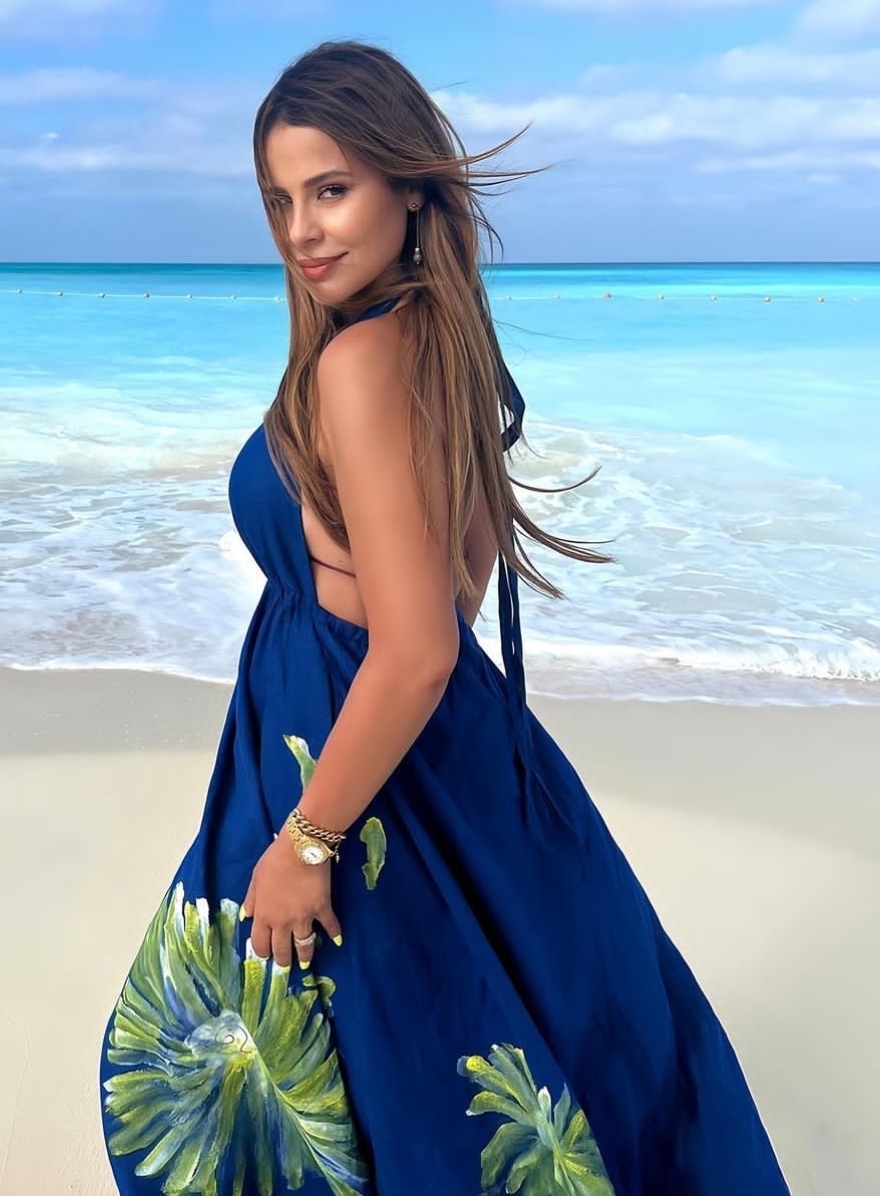 ونجحت كارول سماحة ان تستمع بعطلتها الصيفية وتخضع لجلسة تصوير جديدة أمام الشاطئ لتبدو مثل الزهرة الزرقاء المفعمة بالحياة والحيوية، حيث ارتدت فستان صيفي يتناغم مع أجواء المصيف، صمم الفستان بشكل ناعم ينتمي لقصة ال v، مكشوف الظهر، صمم من قماش ناعم ذا أرضية زرقاء مزركش بالزهور الصفراء، وتزينت ببعض المجوهرات ناعمة.