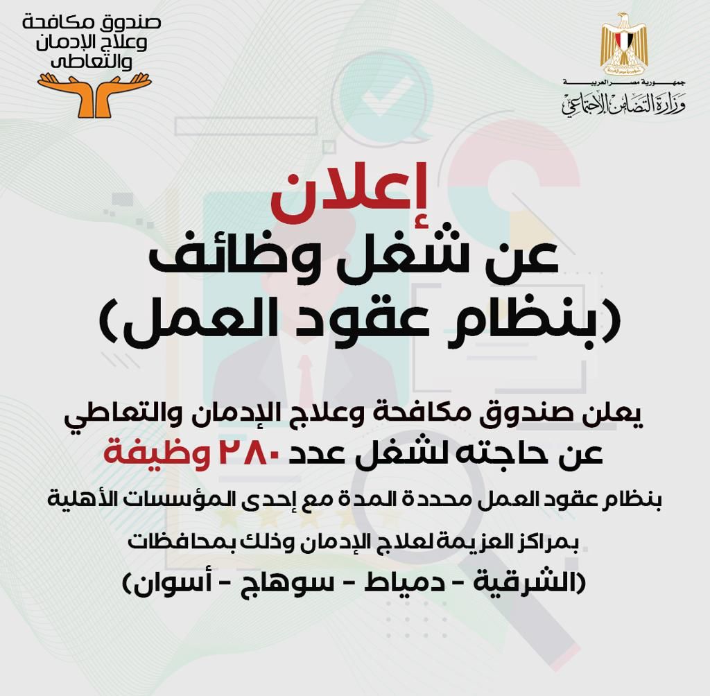أعلن صندوق مكافحة وعلاج الإدمان والتعاطي التابع لوزارة التضامن الاجتماعي عن حاجته لشغل عدد 280 وظيفة بنظام عقود العمل محددة المدة مع إحدى المؤسسات الأهلية.