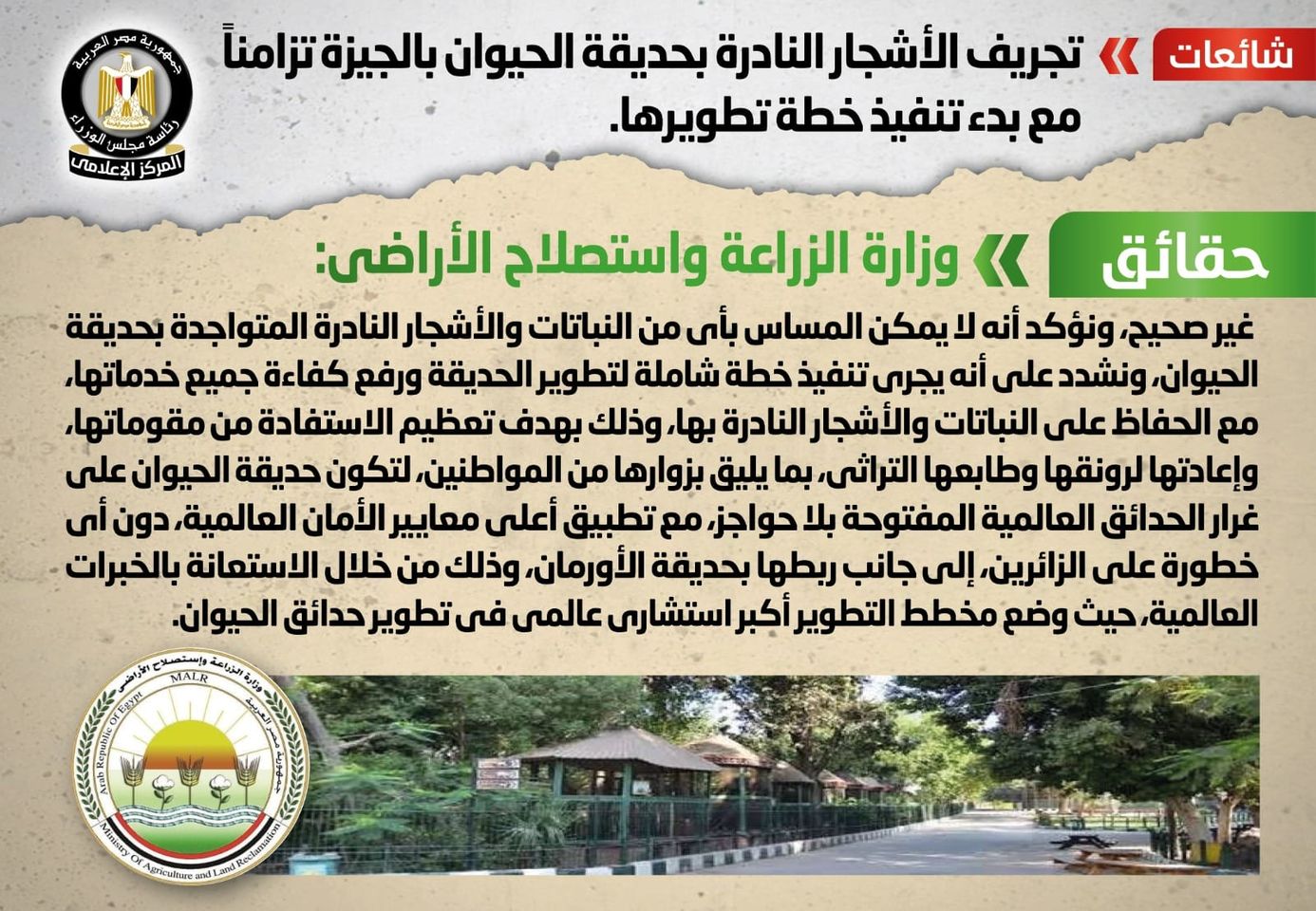 ونفى المركز الإعلامي لمجلس الوزراء بالتواصل مع وزارة الزراعة واستصلاح الأراضي صحة تلك الأنباء، مُؤكدةً أنه لا صحة لتجريف الأشجار النادرة بحديقة الحيوان بالجيزة تزامناً مع بدء تنفيذ خطة تطويرها، وأنه لا يمكن المساس بأي من النباتات والأشجار النادرة المتواجدة بحديقة الحيوان.