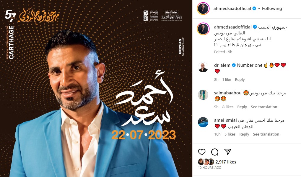 ونشر المطرب أحمد سعد، بوستر الحفل، وعلق عليه قائلًا: "جمهوري الحبيب الغالي في تونس، أنا مستني أشوفكم بفارغ الصبر في مهرجان قرطاج يوم 22".