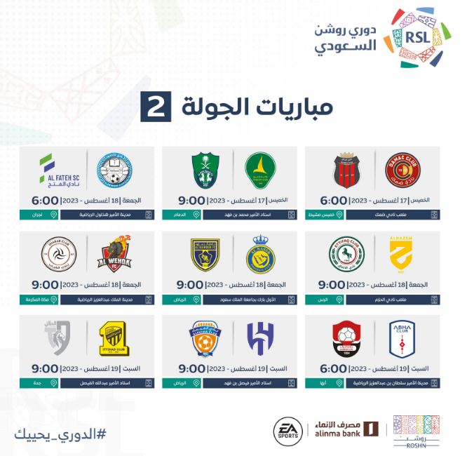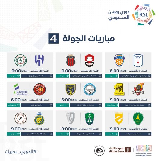 أعلنت رابطة أندية الدورى السعودى للمحترفين عن جدول مباريات أول خمسة أسابيع من عمر مسابقة دوري روشن للمحترفين للموسم الجديد 2023-2024، والتش شهدت قمم مبكره بين الأندية الأربعة الكبرى.