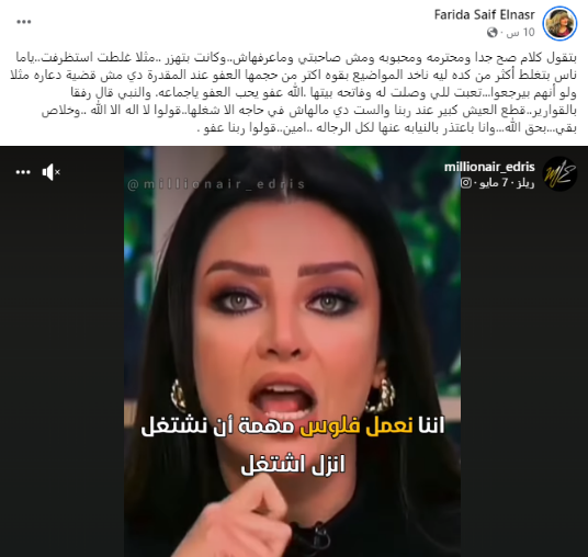 كتبت قالت فريدة سيف النصر: “بتقول كلام صح جدًا ومحترمة ومحبوبة ومش صاحبتي ومعرفهاش وكانت بتهزر، مثلًا غلطت استظرفت، ياما ناس بتغلط أكثر من كده ليه ناخد المواضيع بقوة أكتر من حجمها، العفو عند المقدرة دي مش قضية دعارة مثلًا ولو أنهم بيرجعوا”.