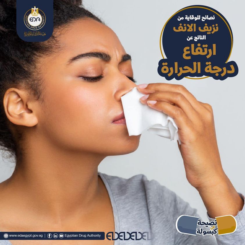 كتبت هيئة الدواء المصرية، في منشور لها عبر حسابها بـ"فيسبوك"، أن أشهر الصيف يمكن أن يتعرض الأنف إلى النزيف بسبب جفاف الجو وسخونته، إذ يؤدى إلى جفاف المخاط الموجود داخل التجويف الأنفي بسبب ارتفاع الرطوبة في الأشهر الحارة.