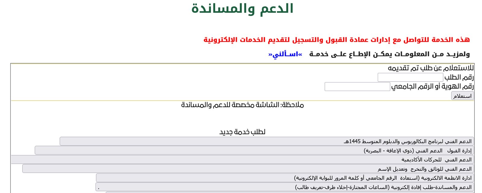 وقالت عمادة القبول والتسجيل بجامعة تبوك، أنها تستقبل جميع استفسارات وتساؤلات القبول الجامعي لعام 1445هـ من خلال فريق الدعم والمساندة، مطالبة المتقدمين متابعة الردود والاجابات عبر البريد الالكتروني المُدخل أثناء تقديم الطلب، وذلك عبر الرابط التالي.. https://ut.edu.sa/ar/Deanship/dar/Pages/hp.aspx