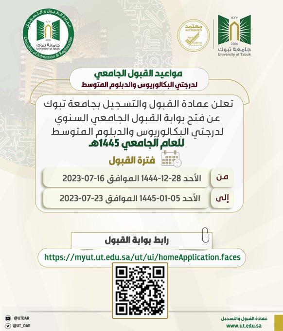 يذكر أن جامعة تبوك كانت قد أعلنت مواعيد القبول لدرجتي البكالويوس والدبلوم المتوسط للعام الجامعي 1445هـ، كالتالي: