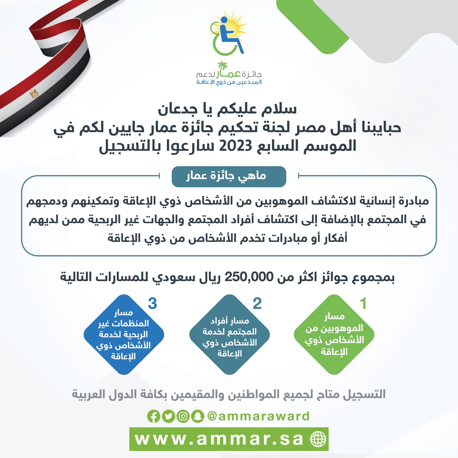 وأعرب رئيس مجلس إدارة جمعية الإرادة للموهوبين من ذوي الإعاقة والأمين العام لجائزة عمار لدعم المبدعين من ذوي الإعاقة، عن تطلعه لمشاركة ذوي الإعاقة من مصر في هذه الجائزة؛ نظرا لما تمتلكه مصر من مواهب فريدة، مضيفاً أن هذا يتلائم مع هدف المسابقة في مشاركة أصحاب المواهب الإبداعية والاستثنائية من ذوي الإعاقة في شتى مجالات الموهبة، بالإضافة إلى مشاركة كافة أفراد المجتمع بأفكار ومشاريع مبتكرة تخدم ذوي الإعاقة وتسهل حياتهم، كما تشارك فيها الجمعيات والمؤسسات والمنظمات غير الربحية بمبادراتهم الاجتماعية ومشاريعهم التنموية التي تساهم في تمكين الاشخاص ذوي الإعاقة.