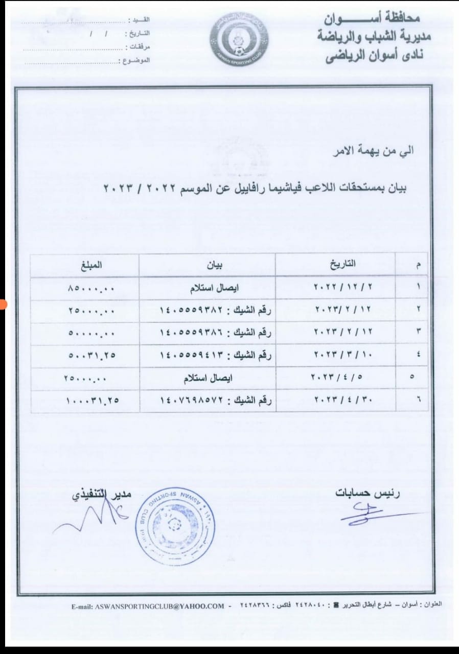 أوضح نادي أسوان الرياضي في بيان رسمي اليوم الاحد كل الإجراءات الإدارية والقانونية والمالية طبقا لبنود التعاقد بين النادي واللاعب النيجيري رافائيل إياجو على مدار الموسم الأول، من تعاقده الممتد مع زهرة الجنوب لمدة ثلاث مواسم تنتهى بنهاية موسم 2024-2025.