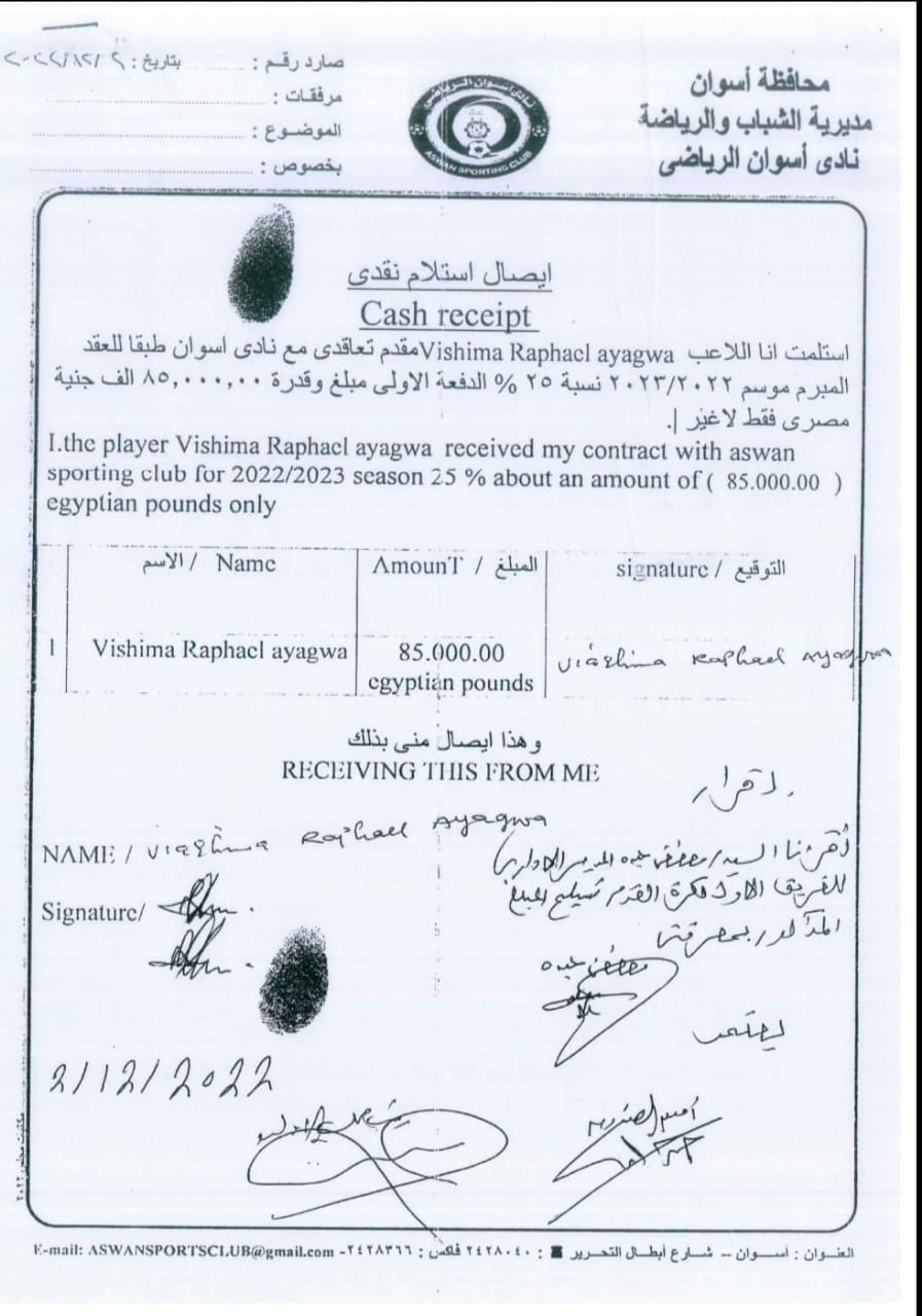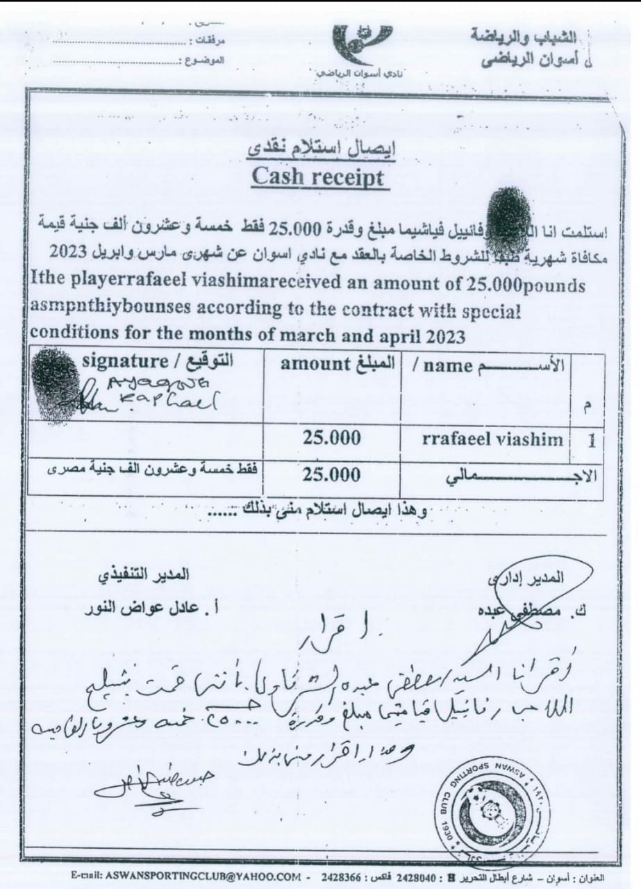 رد نادي أسوان برئاسة المستشار الشافعى صالح على تصرفات اللاعب النيجيرى رافائيل إياجو غير الدقيقة، والتي تهتم بحديث اللاعب عن عدم حصوله على الرواتب.