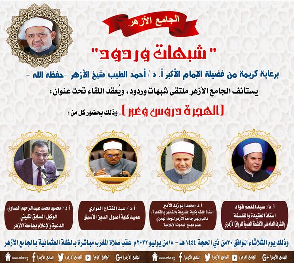 يحتفل ملتقى "شبهات وردود" بالجامع الأزهر الشريف، في ملتقاه الأسبوعي غدا بذكرى هجرة المصطفى ﷺ، تحت عنوان "الهجرة دروس وعِبر"، وذلك تحت رعاية الإمام الأكبر الدكتور أحمد الطيب شيخ الأزهر الشريف، وبتوجيهات من الدكتور محمد الضويني وكيل الأزهر، وإشراف الدكتور عبد المنعم فؤاد، المشرف العام على الرواق الأزهري، والدكتور هاني عودة، مدير عام الجامع الأزهر.