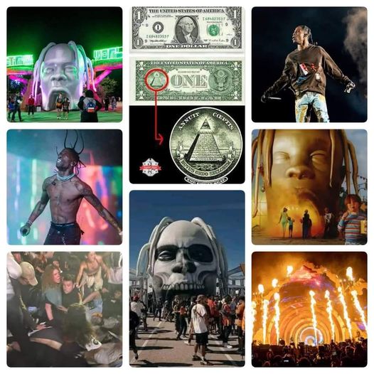 - ترافيس سكوت Travis Scott معروف بدعمه "الماسونية العالمية " ومؤمن بيها والحفلات بتاعته كلها.. والديكور كله يدعم وبيشجع علىٰ الكلام ده سواء رموز أو علامات.. وهو مُعترف بهذا الكلام عادي جدًا علىٰ وسائل التواصل الإجتماعي عنده.