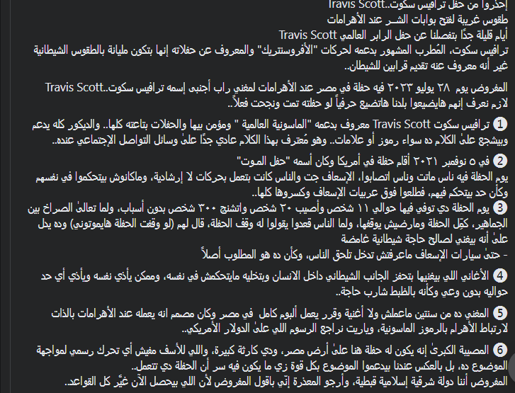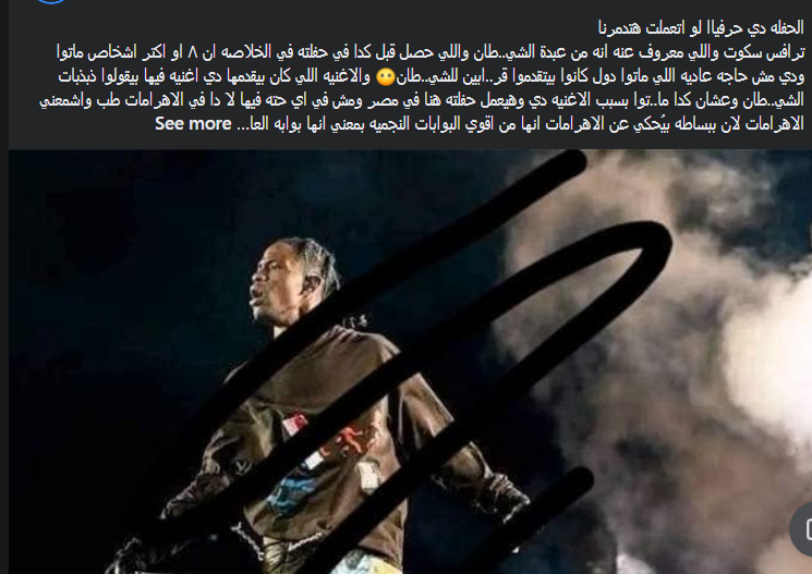وهناك منشور كان الأكثر إنتشارًا على صفحات السوشيال ميديا المختلفة ويفيد بأن: " إحذروا من حفل ترافيس سكوت..Travis Scott طقوس غريبة لفتح بوابات الشـر عند الأهرامات