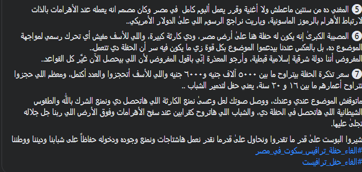 - المصيبة الكبرىٰ إنه يكون له حفلة هنا علىٰ أرض مصر، ودي كارثة كبيرة، واللي للأسف مفيش أي تحرك رسمي لمواجهة الموضوع ده، بل بالعكس عندنا بيدعموا الموضوع بكل قوة زي ما يكون فيه سر أن الحفلة دي تتعمل.