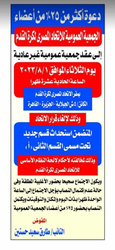وجه النائب طارق سعيد حسانين رئيس نادي الترسانة والمفروض من الجمعية العمومية لاتحاد الكرة الدعوة لأكثر من 20% من أعضاء الجمعية العمومية لاتحاد المصري لكرة القدم لعقد جمعية عمومية غير عادية يوم الثلاثاء الموافق 1 اغسطس الساعة الحادية عشر ظهرا .