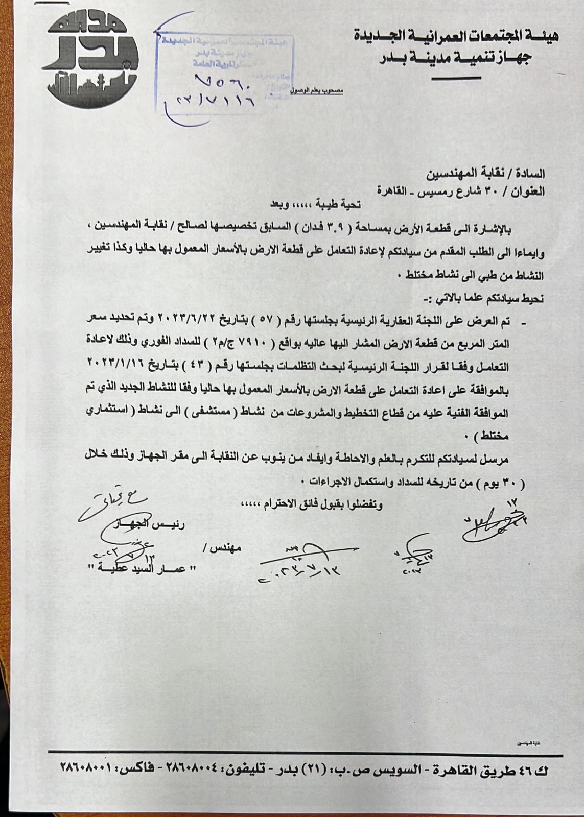 بالإشارة إلى قطعة الأرض بمساحة 3.9 فدان السابق تخصيصها لنقابة المهندسين وإيماء للطلب المقدم بإعادة التعامل على قطعة الارض بالاسعار المعمول بها حاليا وتغيير النشاط من طبى الى مختلط.
