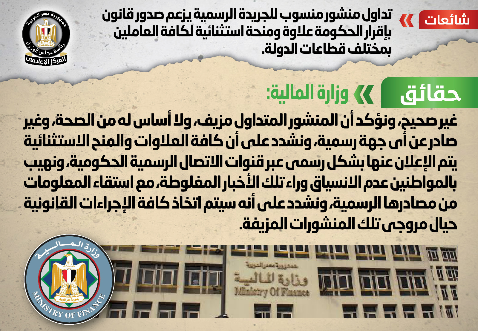 نفى المركز الإعلامي لمجلس الوزراء، ووزارة المالية،  صدور قانون بإقرار الحكومة علاوة ومنحة استثنائية لكل العاملين بمختلف قطاعات الدولة.
