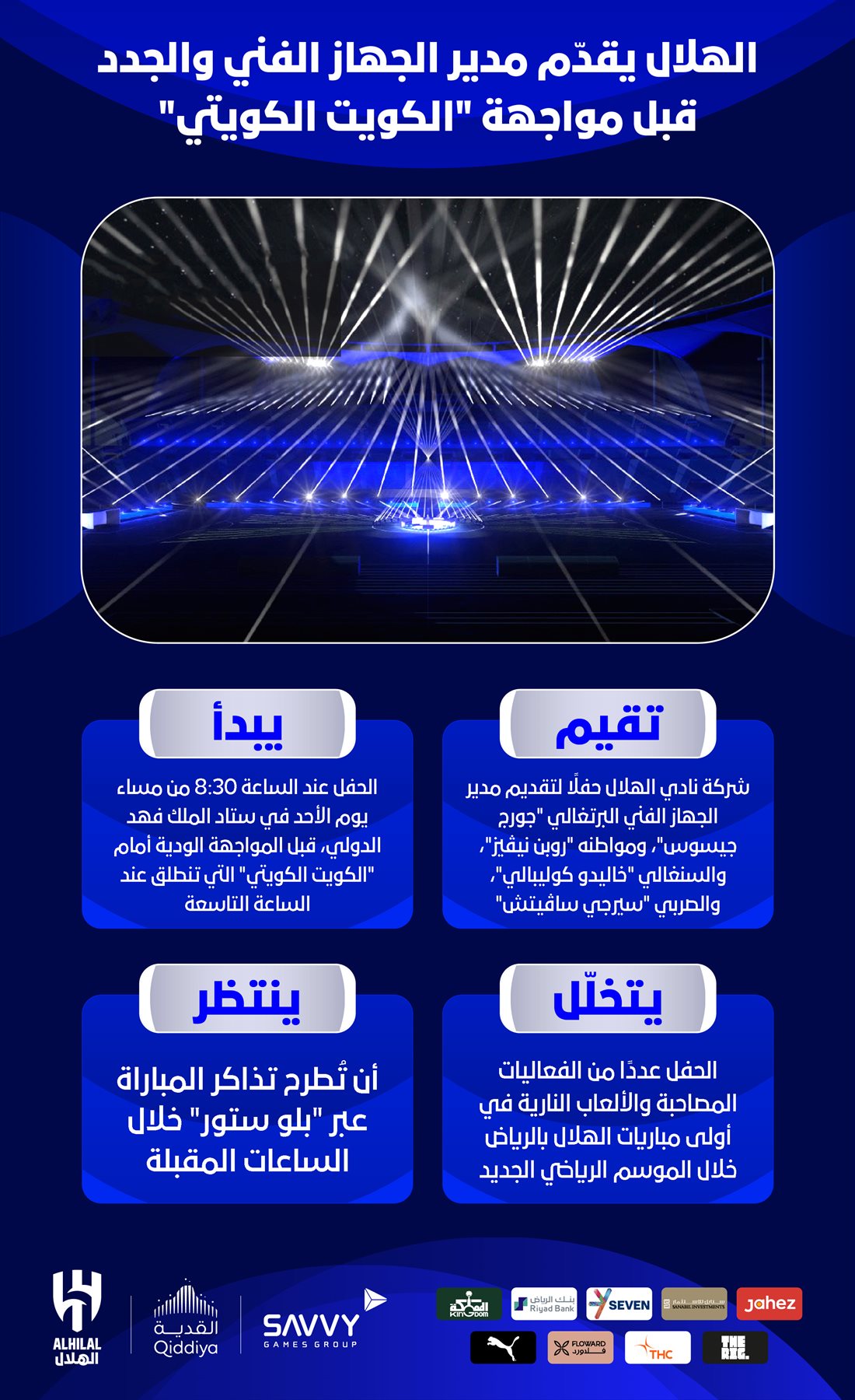 ويقدم الهلال السعودي البرتغالي خورخي خيسوس مدرب الفريق، بالإضافة إلى الوافدين الجدد روبن نيفيز والسنغالي خاليدو كوليبالي والصربي سيرجي سافيتش الوافدون الجدد، إلى الجماهير.
