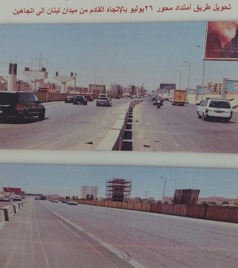 لذا قامت الإدارة العامة لمرور الجيزة بتحويل وتقسيم طريق امتدادًا محور 26 يوليو فى الاتجاه القادم من أعلى محور 26 يوليو وميدان لبنان إلى اتجاهين للحركة المرورية بواقع 5 حارات مرورية لكل اتجاه وفصلهما بحواجز خرسانية ممتدة لمسافة 250 م واستحداث فتحات دخول وخروج للمركبات بين الأعمدة الخرسانية الخاصة بمشروع المونوريل بعد رفع كفاءتها من حيث الطبقة الأسفلتية والإضاءة.