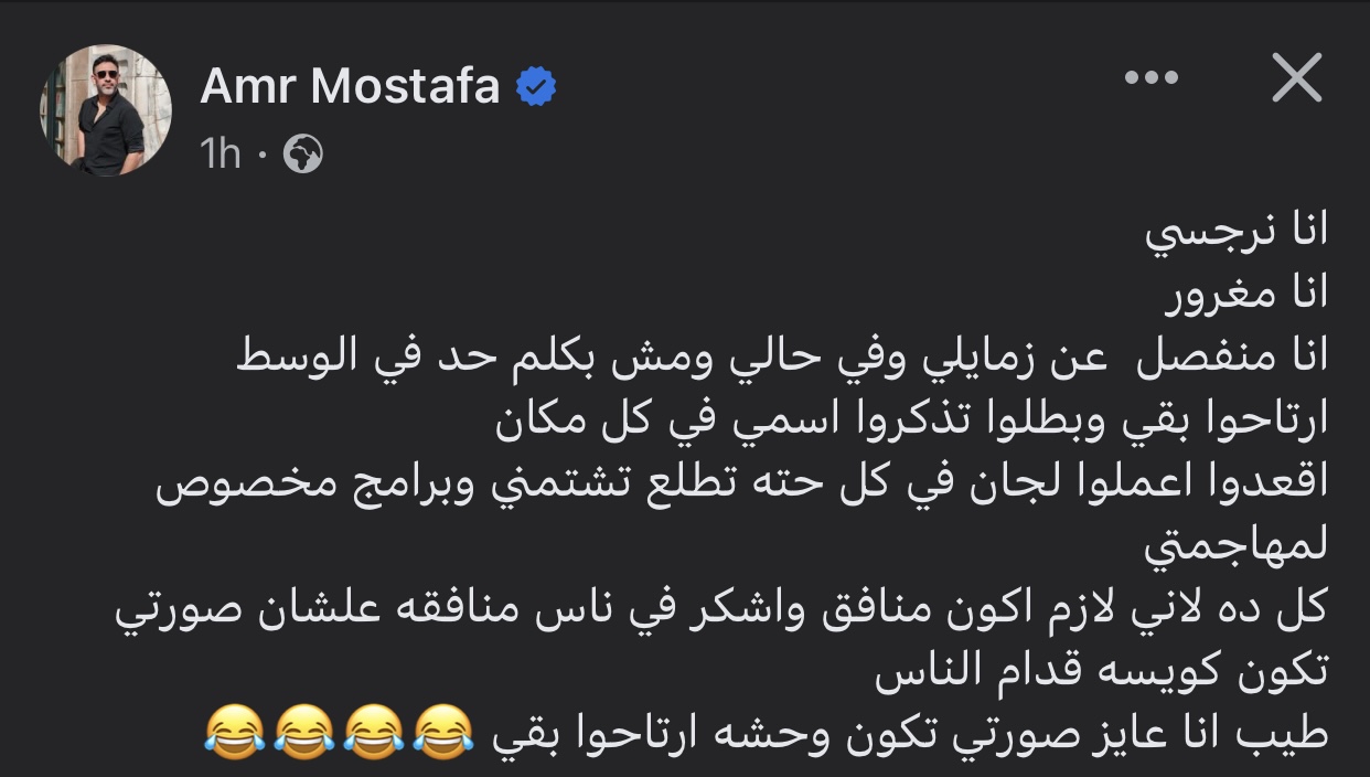 وكتب عمرو مصطفى: "أنا نرجسي، أنا مغرور، أنا منفصل عن زمايلي وفي حالي ومش بكلم حد في الوسط، إرتاحوا بقي وبطلوا تذكروا اسمي في كل مكان".