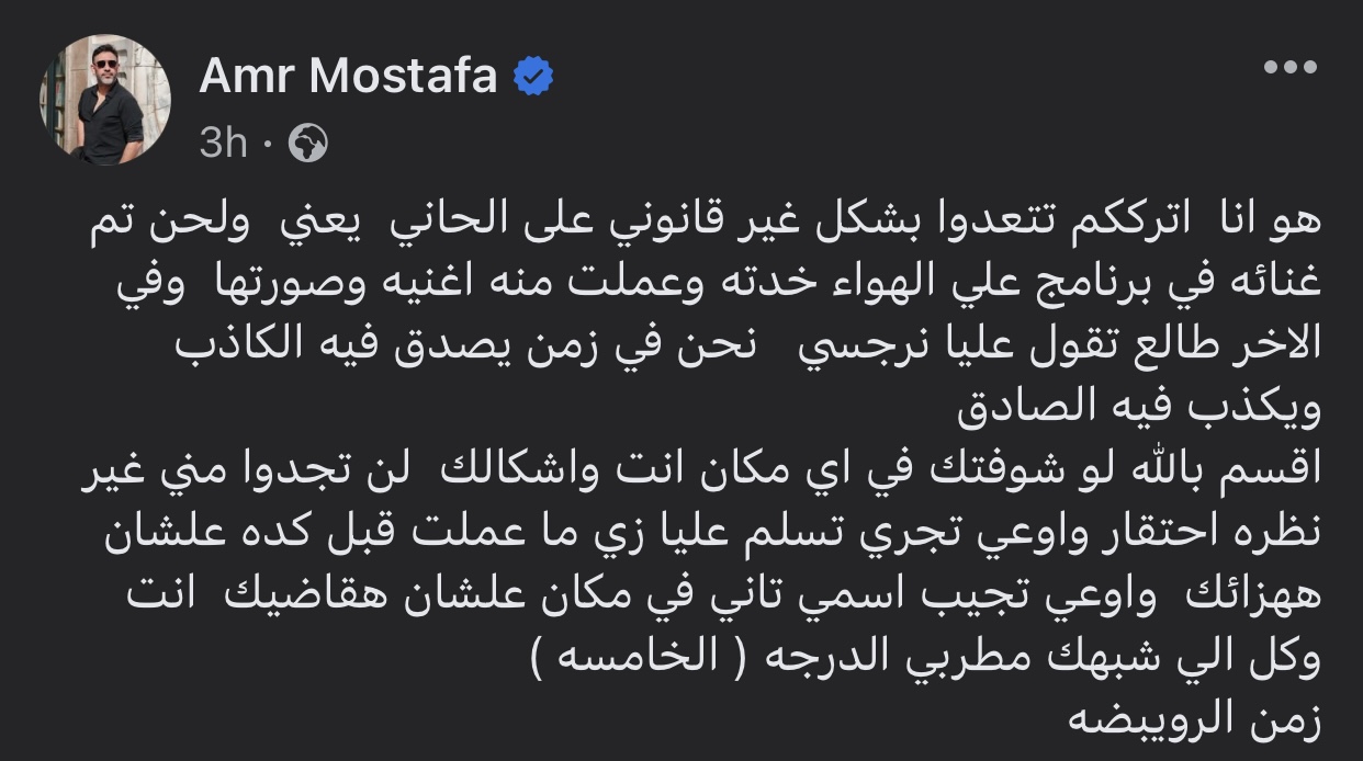 واختتم عمرو مصطفى، قائلًا: "واوعي تجيب اسمي تاني في مكان علشان هقاضيك انت وكل الي شبهك مطربي الدرجه (الخامسه) زمن الرويبضه".