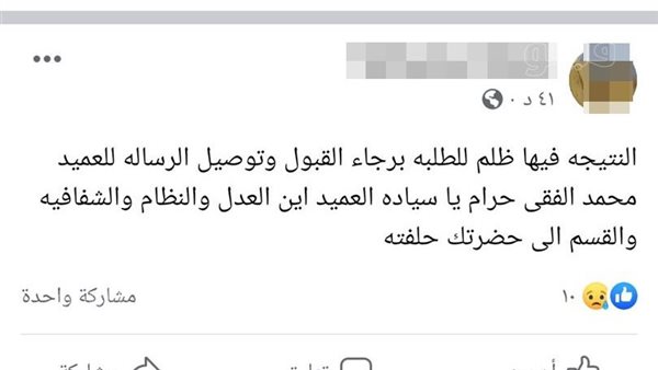 أضاف أشرف، أن عميد الكلية أكد فتح باب التظلمات يوم الإثنين القادم ومن له حق سيحصل عليه، موضحا أن هناك عدد كببر راسب في كل المواد وهو ما لا يستطيع أحد فعل أي شىء معه ولكن الطالب الذي له تظلم في ماده أو مادتين وهم عدد أكبر سينظر لهم في التظلمات.