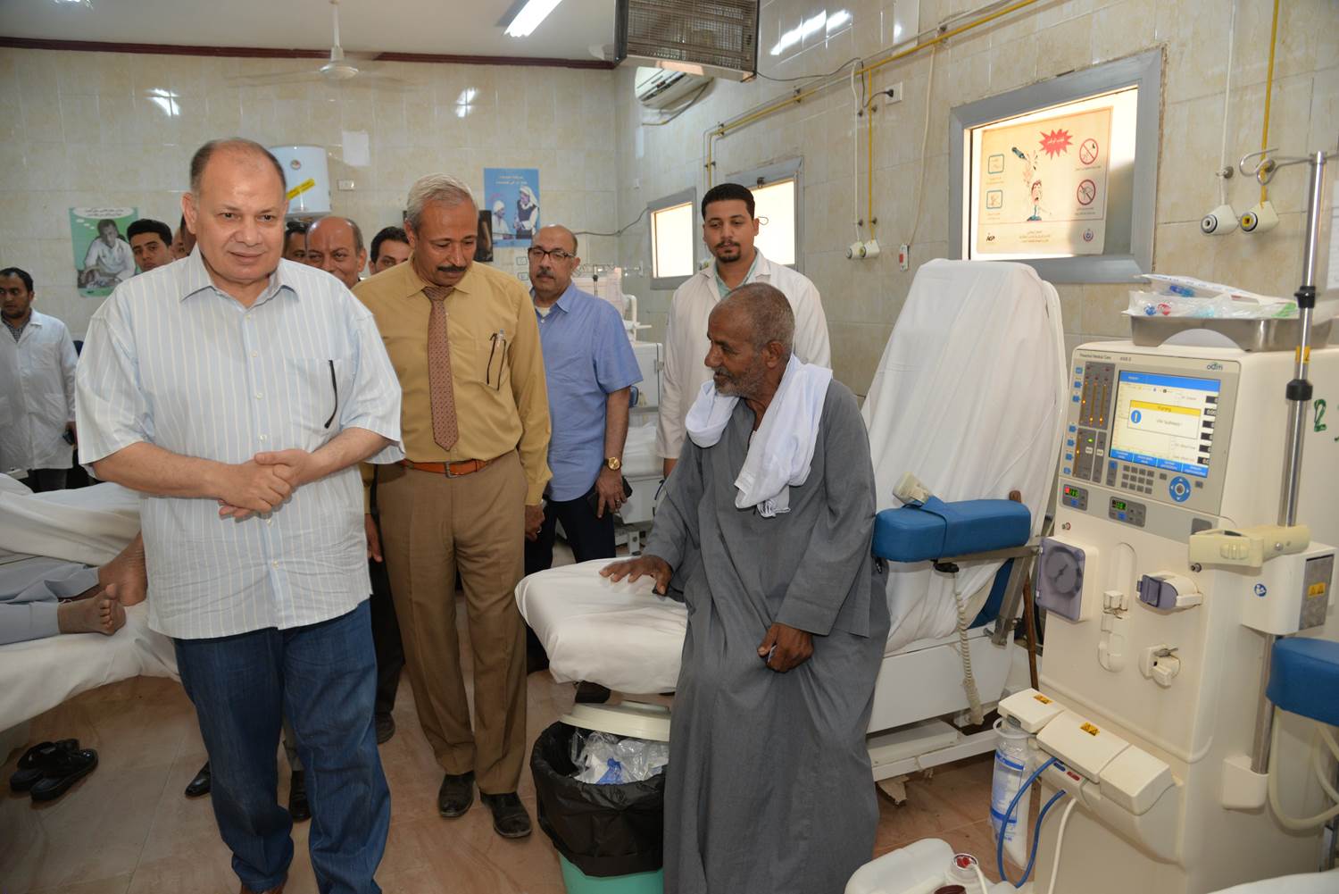 حيث بدأ محافظ أسيوط ومرافقوه جولتهم بتفقد سير العمل بوحدة الغسيل الكلوي بالمستشفى وأطمئن على صحة المرضى ومدى رضاهم عن الخدمات الصحية المقدمة لهم كما التقى بالأطباء والتمريض العاملين بالوحدة واستمع إلى شرح حول امكانيات الوحدة ومدى توافر أجهزة الغسيل الكلوي وأعمال الصيانة الدورية للأجهزة ووحدة المياه بالقسم موجهًا الشكر لجميع العاملين بالوحدة على اهتمامهم بالمرضى ورضا المرضى عن الخدمات المقدمة لهم وطالبهم بضرورة الاهتمام بالأجهزة الطبية والصيانة المستمرة والتعقيم لها بصفة مستمرة وفقًا لخطة العمل فضلًا عن التأكيد على الاستمرار في حسن معاملة المرضى وتقديم كافة سبل الدعم والمساعدة لهم خلال رحلة مرضهم وترددهم على الوحدة كما تفقد المحافظ قسم الاستقبال بالمستشفى والعيادات ووحدة عناية القلب بالمستشفى والتقى بعض المرضى واستمع الى طلباتهم واطمئن على الخدمات الصحية المقدمة لهم كما تفقد أماكن انتظار المترددين على المستشفى للوقوف على مدى رضا المرضى عن الخدمة.
