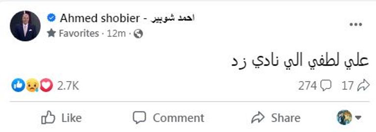 وكتب شوبير عبر صفحته الرسمية على موقع التواصل الاجتماعى فيس بوك “ علي لطفى إلى زد”