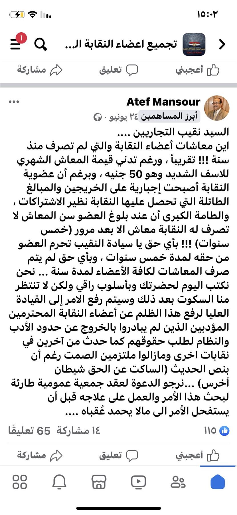 أضاف: تمتنع النقابة عن صرف معاشات أعضائها عند إحالتهم للمعاش بعد بلوغ سن التقاعد من جهات أعمالهم، بالرغم من سدادهم كامل الاشتراكات، مطالبًا الحكومة بضرورة التدخل لزيادة مبلغ المعاش وصرفه بصفة شهرية منتظمة، وصرف المتأخرات.