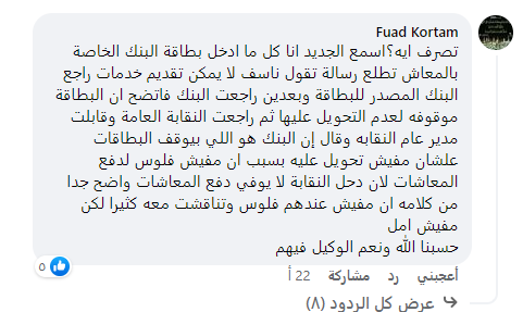 بدوره بدأ البنك المتعاقد مع "التجاريين" وقف البطاقات البنكية التي يودع من خلالها المعاشات؛ وذلك بسبب عدم ضخ المبلغ فيه، وبسؤال النقابة قالت "معندناش فلوس عشان كده البنك وقف البطاقات".