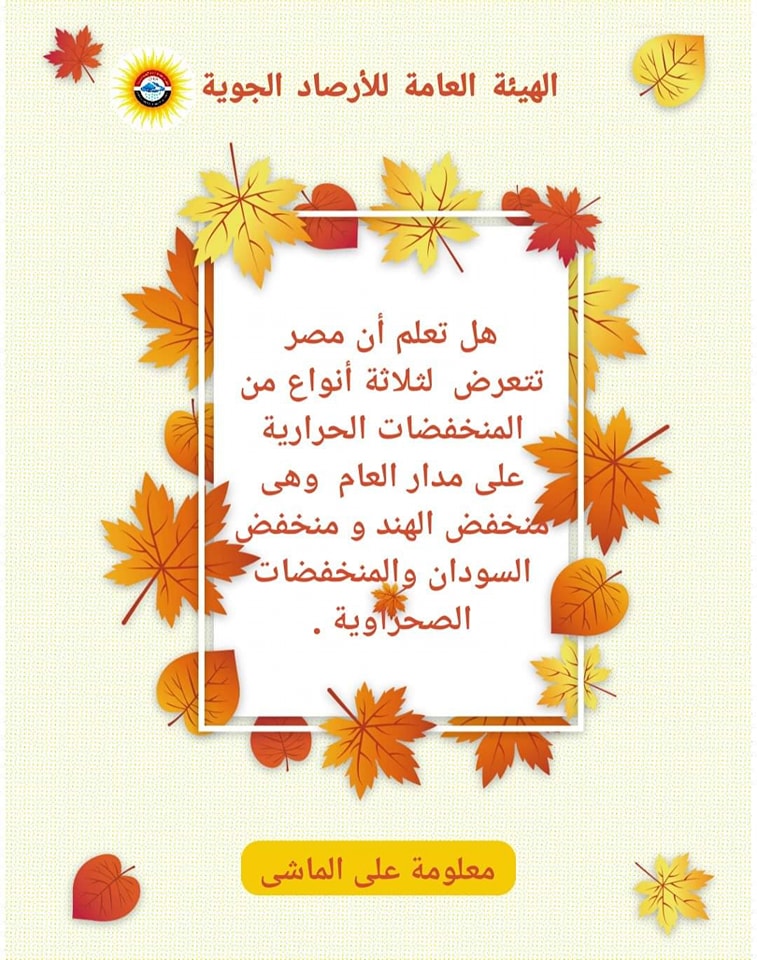 وخلال فقرة “معلومة على الماشي"، المقدمة من قبل الصفحة الرسمية للهيئة العامة للأرصاد الجوية على “فيسبوك”، جاء السؤال "هل تعلم أن مصر تتعرض لثلاث أنواع من المنخفضات الحرارية على مدار العام.