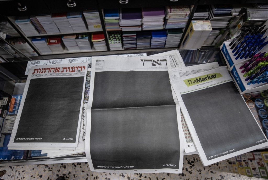 وفوجئ القراء في إسرائيل، بأن الصحف العبرية الكبرى صفحاتها الرئيسية باللون الأسود دون أي خبر أو حتى عنوان، وذلك وسط انتشار الاحتجاجات الواسعة في إسرائيل.