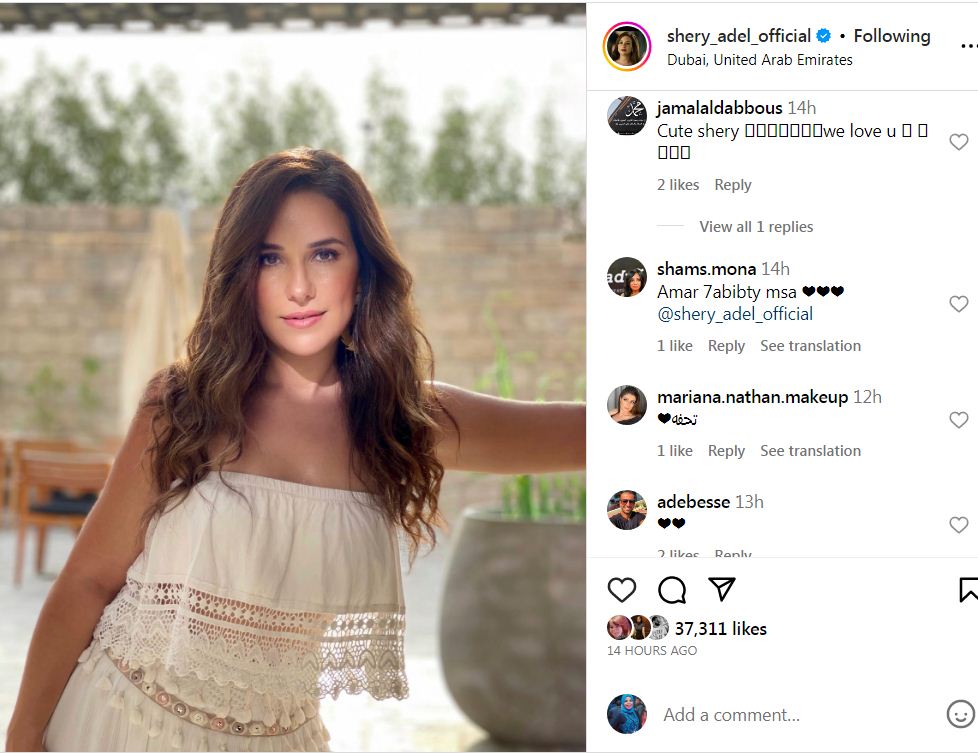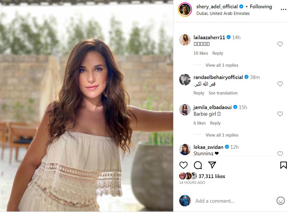 وحرصت الفنانة راندا البحيري على إبداء إعجابها بجمال الفنانة شيري عادل وهذا ما أكدته في تعليقها، قائلة: “قمر الله أكبر”.