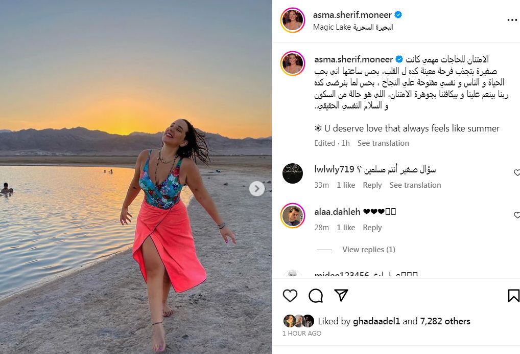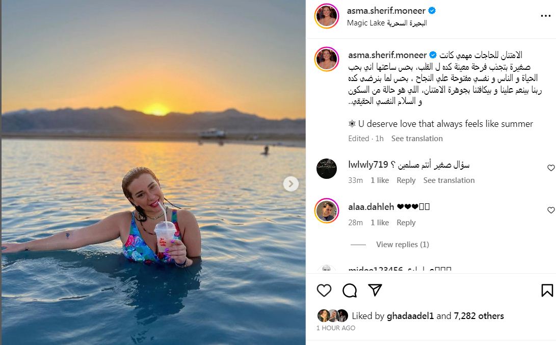 اعتادت الإعلامية أسما شريف منير نجلة الفنان شريف منير على مشاركة متابعيها بأحدث إطلالتها عبر حسابها الشخصي بموقع الإنستجرام، وهذا ما فعلته أثناء قضائها العطلة الصيفية في دهب.