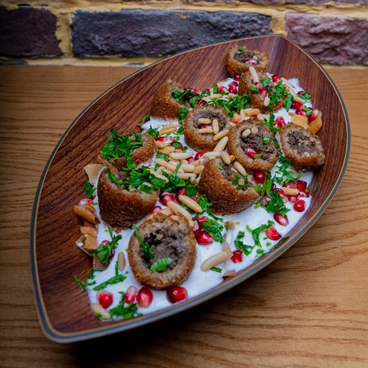في وعاء التقديم نفرد الخبز المحمص، ثم نسكب فوقه صوص اللبن المخلوط، ونضع عليه أنصاف قطع الكبة، ونزين الفتة بالبقدونس والصنوبر المقلي.