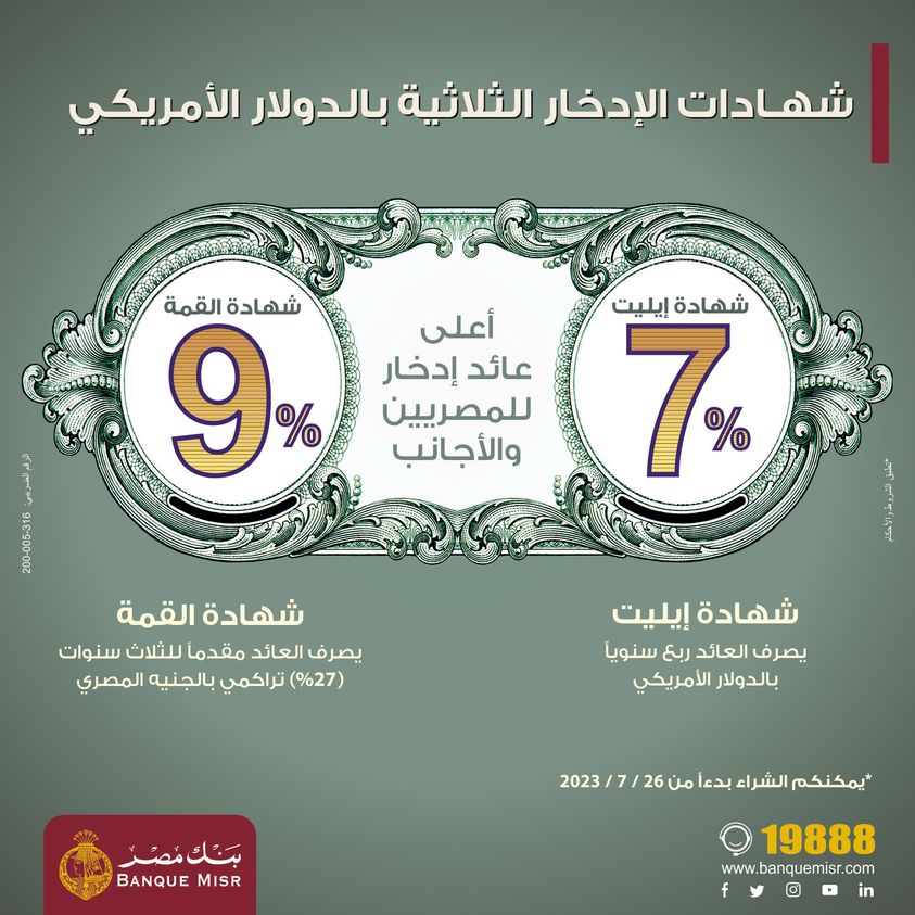 فيما أوضح بنك مصر أن شهادة "إيليت" ذات عائد 7% سنويًا، هي شهادة اسمية تصدر للمصريين والأجانب بفئة 1000 دولار أمريكي ومضاعفاتها، على أن يبدأ تاريخ إصدار الشهادة بداية من يوم العمل التالي للإيداع ويعتبر أساس العائد والاسترداد، ويتم صرف العائد ربع سنوي بالدولار الأمريكي.