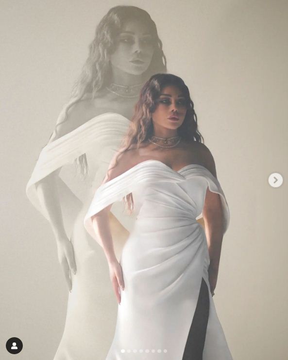 وظهرت هيفاء وهبي في أحدث جلسة تصوير خضعت لها، بفستان أبيض تميز بصيحة الأوف شولدر، وأبرزت منحنيات جسدها وقوامها الممشوق ببعض الطيات ناحية الخصر وبشق من إحدى الساقين، وإرتدت أسفله جوارب أسود شفاف جريء، ونسقت معه حذاء ذا كعب عالٍ باللون الأسود اللامع.