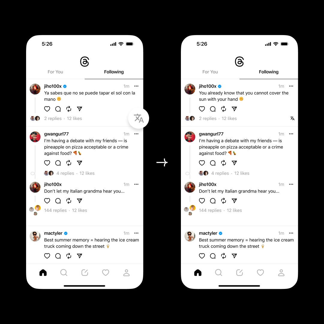 - تتم ترجمة منشورات ثريدز في الموجز تلقائيًا استنادًا إلى اللغة المكتوبة بها وإعدادات اللغة لدى الشخص الذي يشاهدها.
