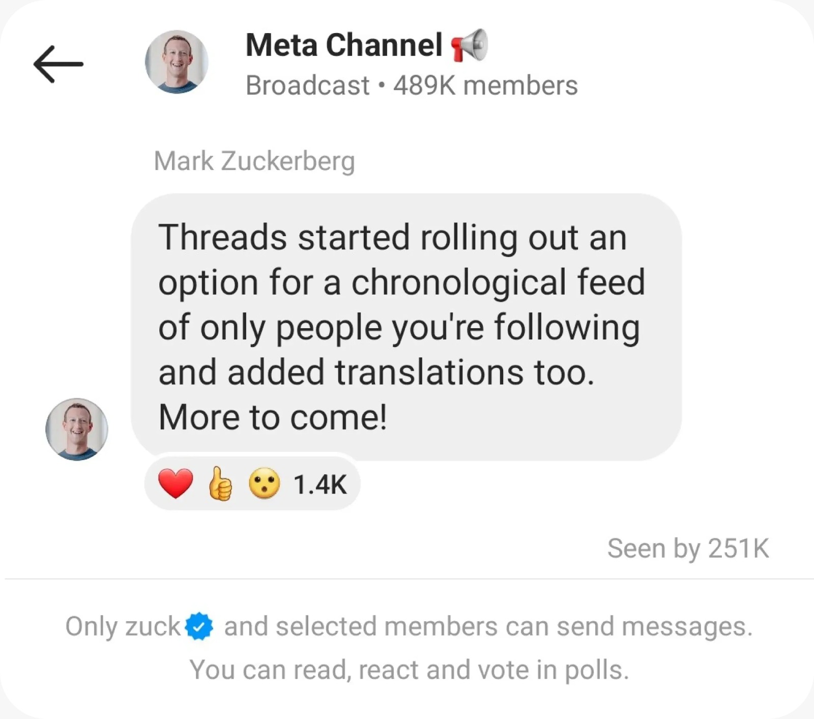 أعلن مارك زوكيربرج عن تحديثات جديدة بتطبيق ثريدز بما في ذلك موجز المتابعة والترجمات، منذ إطلاق ثريدز.