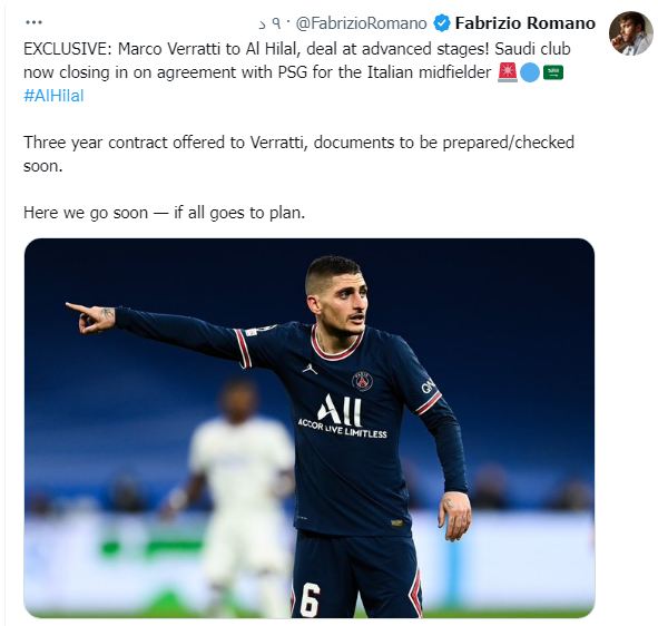 إذ كشف الصحفي الإيطالي فابريزيو رومانو خبير أسواق الانتقالات العالمي أن نجم خط وسط باريس سان جيرمان فيراتي أصبح قريبًا من الهلال السعودي.