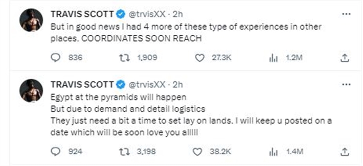 وكتب ترافيس سكوت: "حفلي بالأهرامات سيتم ولكن بسبب تفاصيل لوجستية ومتطلبات المسرح الكثيرة، نحتاج وقت أطول. سوف نعلن عن موعد جديد قريبا"، وأضاف في تغريدة أخرى: "الأخبار السعيدة هي أنني واجهت مشاكل مثل هذه في أماكن أخرى".