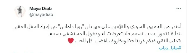 نشرت مايا دياب منشورًا معبرًا: "أعتذر لجمهوري السوري والمقيمين على مهرجان روزا داماس عن عدم إحياء الحفل المقرر غدًا 27 يوليو بسبب تسمم حاد تعرضت له ودخلت المستشفى بسببه".
